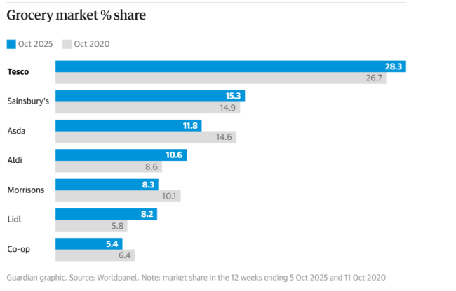 가디언 기사를 보면 테스코는 매출의 14%가 가정의 온라인 주문으로 나오고 있고, 매출은 증가하고 있다고 한다. 또 온라인에서 오프라인보다 훨씬 더 강력한 지배력을 행사하며, 영국 온라인 식료품 판매량의 37%를 점유하고 있다고 했다. (https://www.theguardian.com/business/2025/oct/19/tesco-britain-biggest-retailer-dominates)