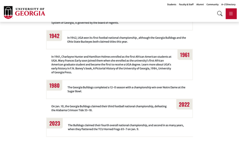 사진 2. 조지아대 홈페이지의 학교 연혁 소개는 풋볼팀의 우승 기록이나 다름없습니다.