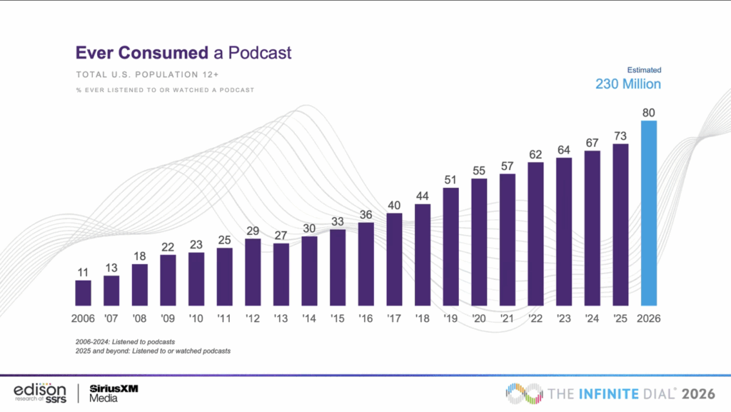 단순히 명맥을 유지하는 정도가 아닙니다. 팟캐스트는 미국을 중심으로 꾸준히 성장하며 영향력을 넓히고 있습니다. 2026년 1월, 미디어 여론조사기관 에디슨리서치가 미국 전역에서 12세 이상 2,050명을 상대로 설문 조사한 결과, 팟캐스트를 한 번이라도 듣거나 본 적이 있다고 답한 비율은 80%로 나타났습니다. 미국에서만 2억 3,000만 명가량이 팟캐스트를 접해 봤다는 뜻입니다. 미국인의 팟캐스트 이용률은 2013년부터 줄곧 상승하고 있으며, 정기적으로 팟캐스트를 트는 비율 또한 증가세입니다. 이번 조사에선 응답자의 58%가 지난달, 45%는 지난주에 팟캐스트를 소비했다고 밝혔습니다. 각각 1억 6,700만 명과 1억 3,000만 명으로 추산됩니다.
